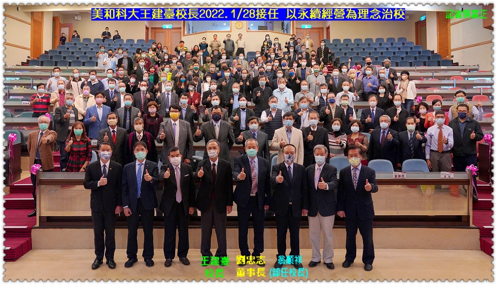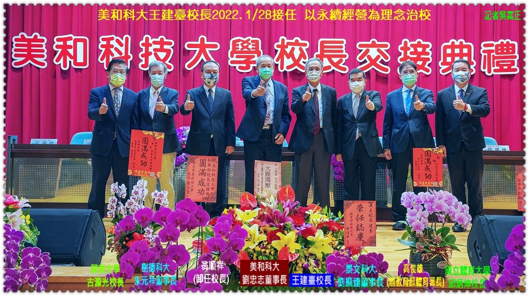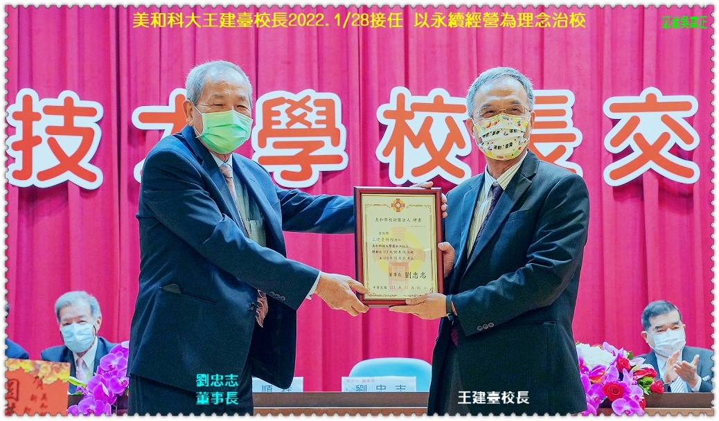 【美和科技大學】2022.1/28舉行校長交接典禮,交接儀式由劉忠志董事長頒發王建臺第五任校長聘書,並在董事長監交下,卸任校長翁順祥將印信交給新任校長王建臺,任期將自2022年2/1至2025年1/31。