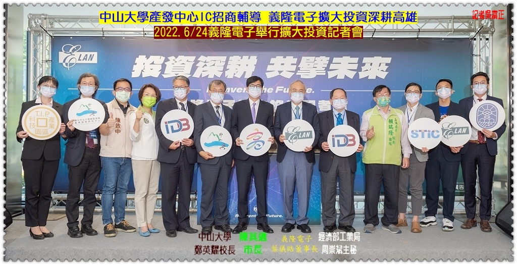 【中山大學】產發中心協助經濟部工業局營運「南部晶片設計研發培育中心」,自2012年招商輔導義隆電子(股)公司進駐高軟並籌組南部研發團隊,10年來研發量能穩定成長,6/24義隆電子舉行擴大投資記者會,對外宣示「義隆電子人工智慧研發中心」設立並正式喬遷進駐亞灣-鴻海大樓,由經濟部工業局周崇斌主秘、高雄市陳其邁市長、義隆電子葉儀晧董事長、中山大學鄭英耀校長共同啟用揭幕,義隆電子正式宣佈擴大投資高雄,擴編招募百名研發人才。