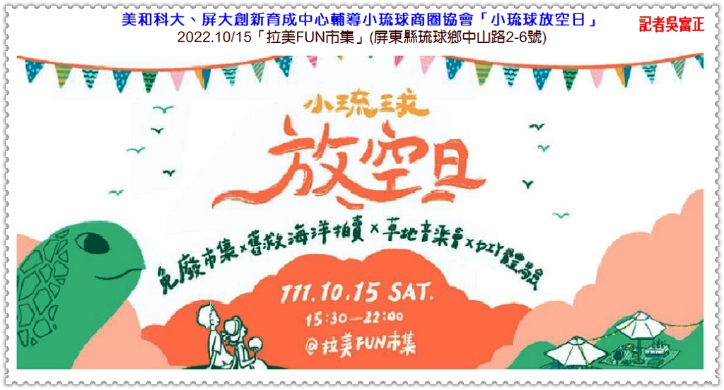 【屏東大學】、【美和科技大學】2022年輔導「小琉球商圈發展協會」獲得經濟部中小企業處2022故事商圈競賽金獎(第一名)」,10/15(六)15:30-22:00於小琉球「拉美FUN市集」(屏東縣琉球鄉中山路2-6號)舉辦「小琉球放空日」,包含「免廢市集」、「舊救海洋拍賣」、「草地音樂會」、「DIY 體驗」等活動,串連在地企業、協會、業者,在兼顧環保及海洋資源永續的目標,推廣小琉球為一年四季皆適合拜訪的低碳永續觀光島,藉此強化『小琉球。低碳旅遊島』形象。當日搭配環保碗筷租借、琉行杯租借,進行環保生態及海洋知識短講與循環肥皂、食魚教育等體驗,期盼藉以吸引民眾走出都市叢林、享受戶外時光,在拉美FUN市集中沐浴草地月光。[小琉球商圈發展協會]林美慧理事長藉由活動倡導小琉球「生態永續觀光島」之概念,將帶給民眾不一樣的夜晚特殊體驗。