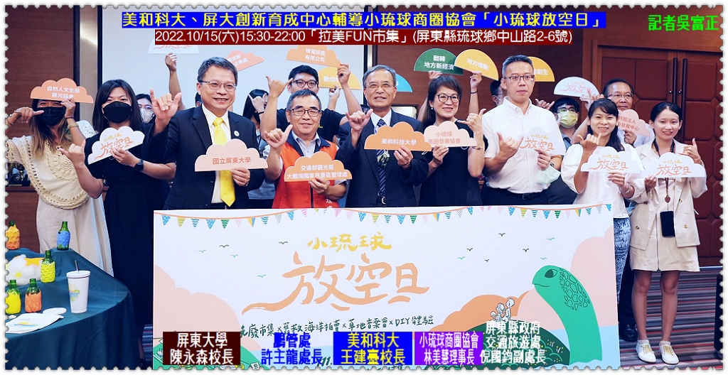 ▓【屏大】、【美和科大】兩校創新育成中心輔導[小琉球商圈發展協會]在地商家,在經濟部中小企業處、屏東縣政府交通旅遊處、大鵬灣國家風景區管理處、中衛發展中心指導下舉辦「小琉球放空日」市集,期望從生態旅遊的角度出發,以「永續觀光、數位提升」為核心,與社團法人 RTM 泛旅遊協會串聯琉球在地協會(小球魅力商圈協會、琉球鄉觀光發展協會、社團法人台灣咕咾嶼發展協會、自然人文解說觀光協會等)、酷遊天(股)公司、蜂電綠能有限公司,產官學共同合作,結合多方力量,以永續為目標,共同攜手協助當地特色商家發展。