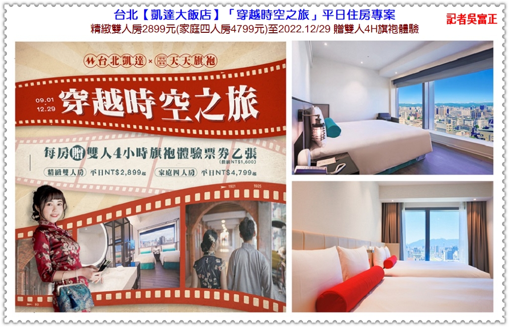 台北【凱達大飯店】為推廣萬華在地觀光,帶領大家透過旅人視角探索萬華的美好,與「天天旗袍體驗館」聯合推出「穿越時空之旅」平日住房專案,精緻雙人房2899元(家庭四人房4799元),週六僅加價500元,專案加贈價值1600元「雙人4小時旗袍體驗票券」乙張(體驗前三天與天天旗袍預約0933-208566),周一至周四再享限量升等至豪華客房,活動時間至12/29。