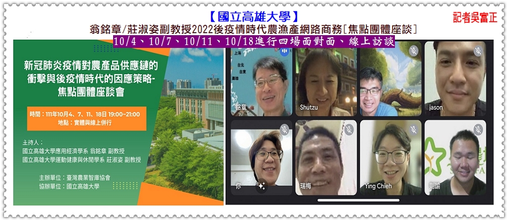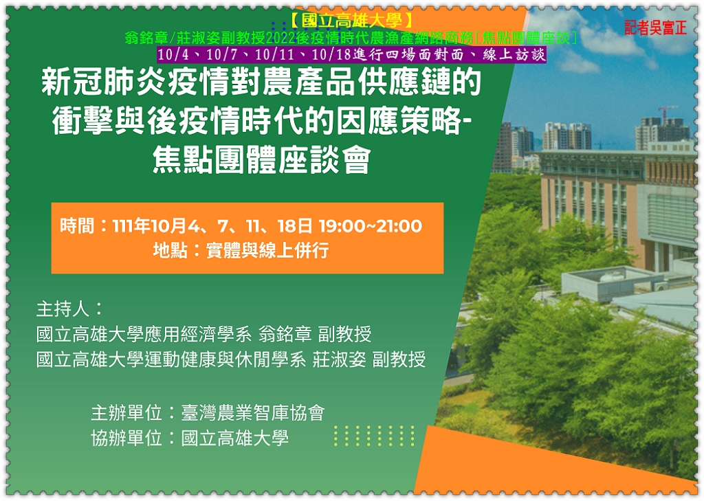 【國立高雄大學】翁銘章副教授、莊淑姿副教授鑑於疫情時期,人們的消費型態受到相當大的影響,因應疫情時代的發展,有感於農業產品的運銷需要適時的因時制宜,才能創造生產者、中間商、消費者三贏局面,針對此主題進行相關研究,為了解生產供給面及市場需求面的狀態變化,針對生產者以及網路銷售平台的業者,10/4、10/7、10/11、10/18進行四場[焦點團體座談],對象分別是農漁產生產者、銷售者、電商網路銷售平台業者,主要探討議題是要了解供需業者如何因應疫情時代宅經濟的發展、政府部門應該如何面對宅經濟的興起,以及對農產品業者的輔導如何因應。