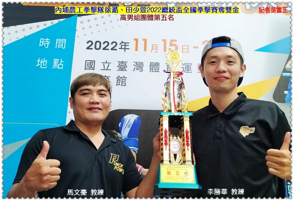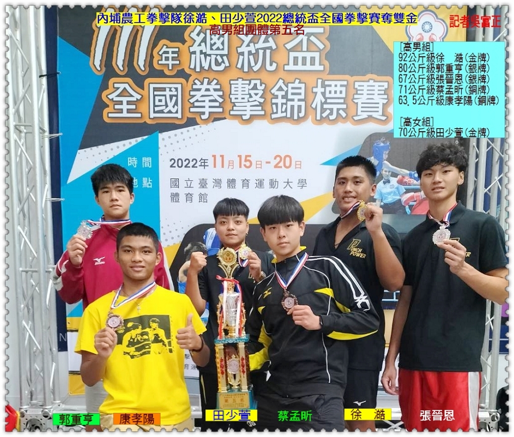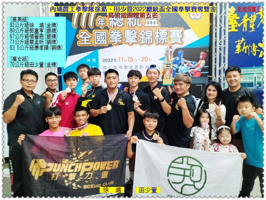 【內埔農工】拳擊隊參加「111年總統盃全國拳擊錦標賽」,八位參賽選手共摘得2金2銀2銅[高男組92公斤級徐澔(金牌)、80公斤級郭重亨(銀牌)、67公斤級張晉恩(銀牌)、71公斤級蔡孟昕(銅牌)、63.5公斤級康孝陽(銅牌),高女組70公斤級田少萱(金牌)],並獲高男組團體第五名。