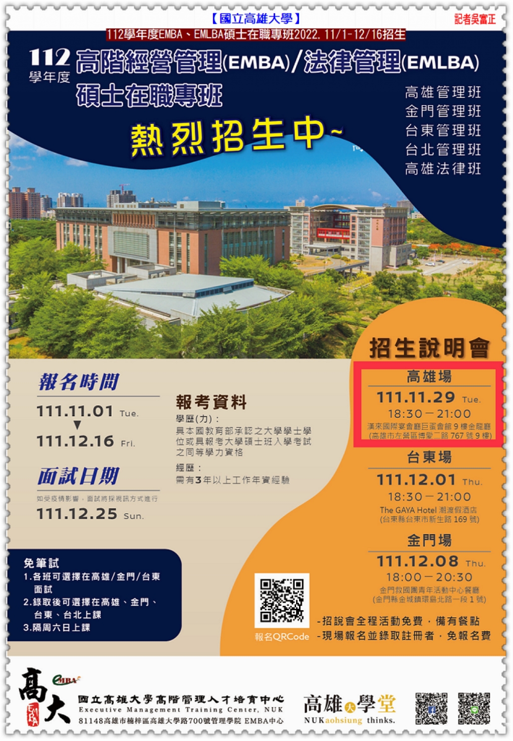 【國立高雄大學】112學年度高階經營管理(EMBA)、高階法律管理(EMLBA)碩士在職專班2022.11/1-12/16招生報名,舉辦11/29高雄場、12/1台東場、12/8金門場招生說明會;【高雄大學】EMBA高雄、金門、台東、台北管理班及EMLBA高雄法律班皆已開始報名,歡迎有志青年及社會菁英報名就讀,入學免筆試,隔週末上課,兩年取得國立大學碩士學位。