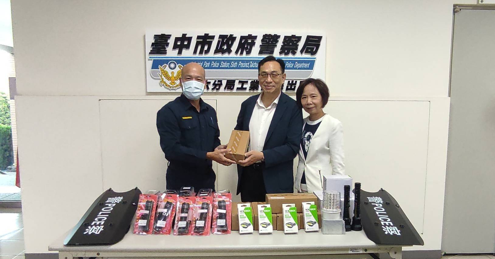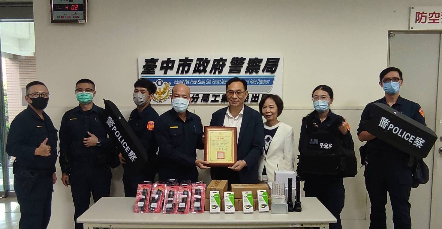 張董事長表示,從臺中工業區下班回家途中,常看到員警穿梭在川流不息的下班車潮中,無論是處理交通事故,或是執行路檢,雖然身穿反光背心,但亮度仍顯不足,看起來險象環生,令他印象深刻,所以決定添購LED手電筒、帽燈、爆閃燈、充電式鋁合金臂盾及辣椒水等大量夜間執勤裝備,贈送給中市第六警分局工業區派出所,另外更加碼致贈全新高畫質電視及辦公椅,提升派出所的辦公環境品質。