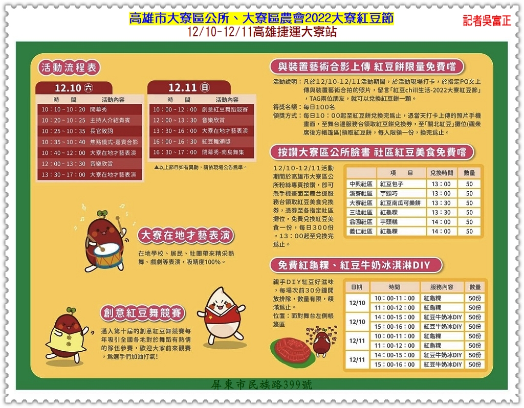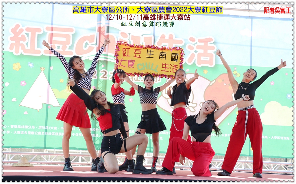 高雄市大寮區公所、大寮區農會12/10-12/11合辦「2022大寮紅豆節-紅豆CHILL生活」,12/10展開延續10年的大寮居民才藝演出和紅豆創意舞蹈競賽,並加入每日按讚送300份紅豆美食,與裝置藝術拍照打卡兌換紅豆餅活動,現場130幾攤大寮在地農特產品和美食,展現大寮農業的優質發展。