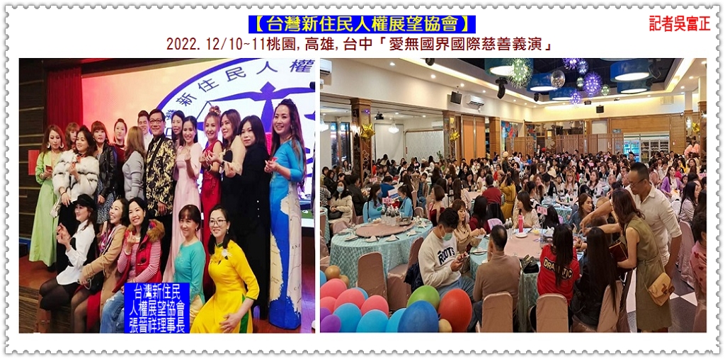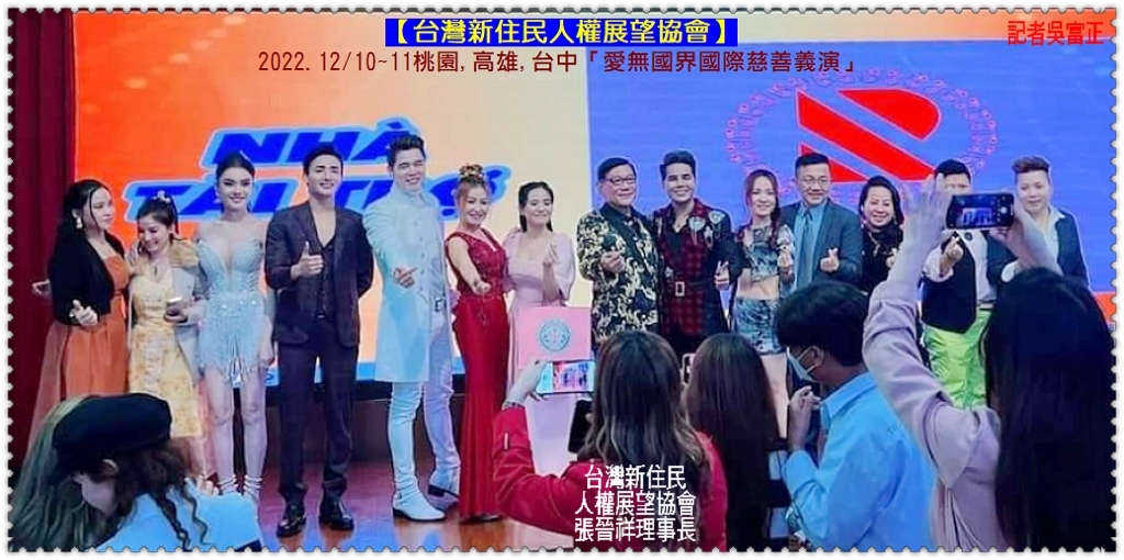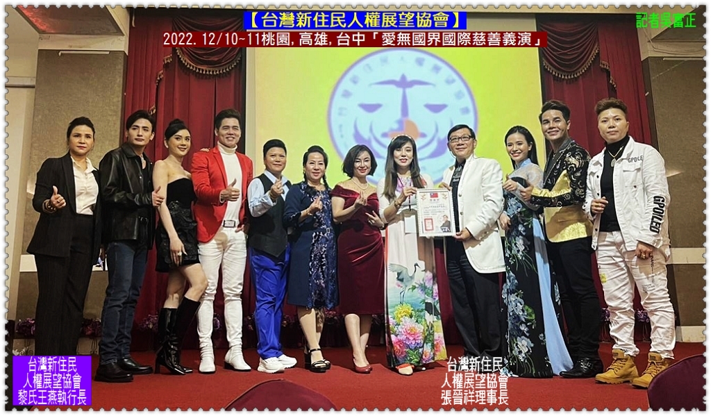 【台灣新住民人權展望協會】張晉祥理事長、黎氏王燕執行長12/10-11於桃園&高雄&台中舉辦三場「2022愛無國界國際慈善義演」,約1000餘位新住民同歡;越南一線歌星劉志偉、公主林慶芝、阮文善等紅星炒熱氣氛,現場還有摸彩活動,鄭運鵬立委、湯蕙禎立委蒞臨嘉勉。