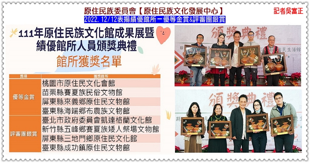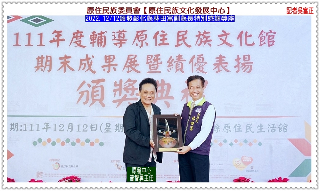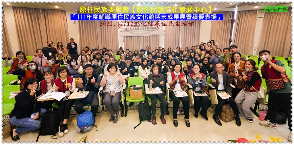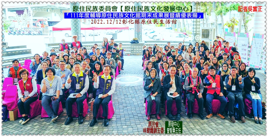 原住民族委員會【原住民族文化發展中心(原發中心)】為紀念陪伴原文館茁壯的師長與戰友,並表揚績優館所及館所靈魂人物—策展員與文專人員,12/12於彰化縣原住民生活館辦理「111年度輔導原住民族文化館期末成果展暨績優表揚頒獎典禮」,原民會林碧霞副主委、【原發中心】曾智勇主任、彰化縣林田富副縣長、桃園市政府原住民族行政局林日龍局長、彰化縣政府民政處賴致富處長、臺東縣海端鄉公所胡金至鄉長及各國立博物館輔導委員蒞臨,一同分享並見證原文館佳績。活動並安排「中區7館聯展-我們群祭啦」導覽與期末會報,帶領貴賓及會眾通過觀賞及分析報告,深入了解各館田調與策展的專業外,再次肯認【原發中心】與國立大館分區輔導策略的成果。