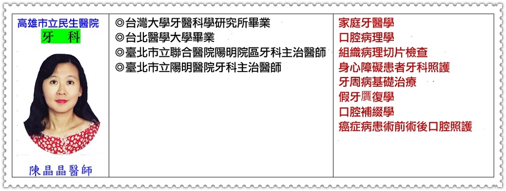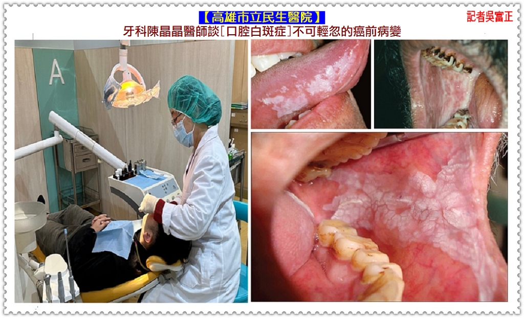 【高雄市立民生醫院】牙科陳晶晶醫師分享,[口腔白斑症]是口腔內無法刮除的白色病變,顏色以白色為主,有些會略帶紅色或是紅白相間,由於大部分患者不會有特別的感覺,所以在病症初期最容易被忽略,有些患者會感覺斑塊處黏膜部位有粗糙,甚至輕微疼痛後才會就醫,其實口腔白斑症與口腔癌關係密切,患者切勿掉以輕心。口腔白斑症的可能原因包括抽菸、喝酒、嚼檳榔、以及不良假牙的慢性刺激等,臨床上經過二至四週的追蹤,一部分病人的斑塊會消失。未消失的白斑若切片檢查顯示沒有其他變化,可用光動力治療、冷凍治療、二氧化碳雷射切除,病症約二至四周就會復原。但若白斑症已有上皮發育異常或疣狀增生時,則建議將病灶整個切除,再施以植皮手術。一般的口腔白斑約有10% 可能將來會惡化成為口腔癌,若已伴隨有疣狀增生、上皮發育異常的口腔白斑,日後發生口腔癌的機會更大。