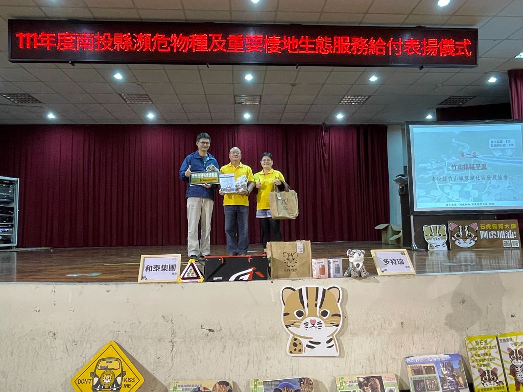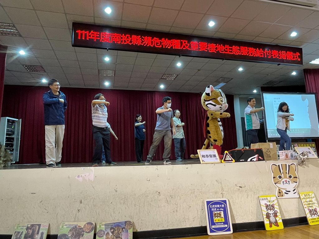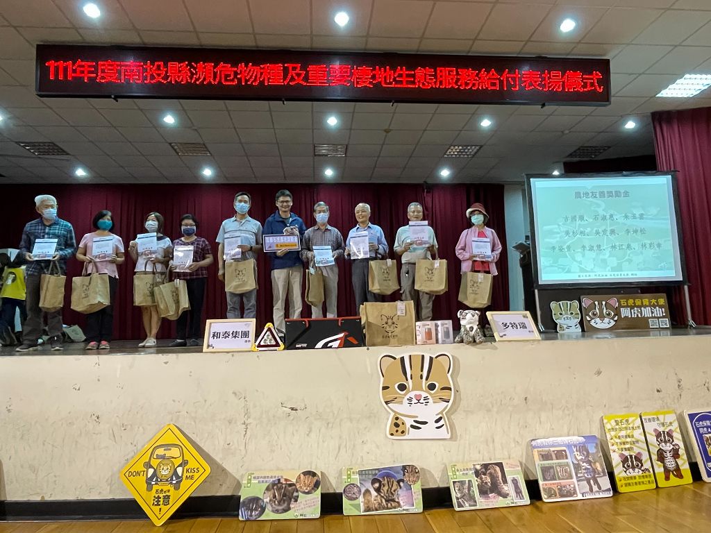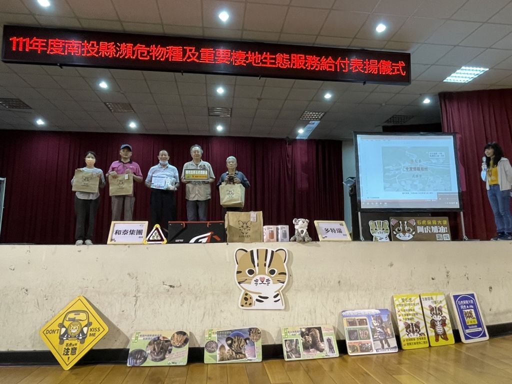 南投縣府19日下午在中寮鄉公所大禮堂舉辦「石虎有你真好─2022年成果分享暨符合請領獎勵金表揚儀式」,公開表揚111年度參加「南投縣瀕危物種及重要棲地生態服務給付推動方案」的農民、養禽戶和社區巡守隊。本次表揚由農業處科長張景富、農委會林務局南投林區管理處處長李政賢、特有生物研究保育中心副主任林旭宏、中寮鄉公所秘書林文遠、集集鎮課長莊桂惠以及三立電視台資深製作人白心儀等人出席頒獎。