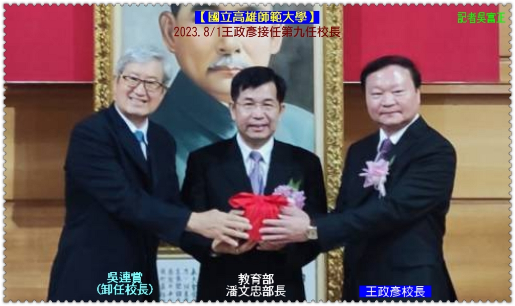 【國立高雄師範大學】2023.8/1第9任「卸新任校長交接」典禮(吳連賞卸任、王政彥接任),教育部潘文忠部長監交,邀請台灣教育大學系統總校長吳清基、前校長戴嘉南、前校長蔡培村、高雄大學陳月端校長、屏東大學陳永森校長、樹德科大王昭雄校長、全國校友總會長吳敏男、林岱樺立委等擔任貴賓,並有教育界、企業界、警調界、體育界、各縣市校友會校友及高師大教職員工等,近五百人出席觀禮祝賀。