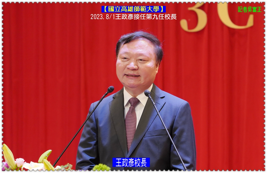 ※新任校長王政彥出生雲林農家,畢業於雲林縣莿桐國小、嘉義市輔仁中學、國立政治大學(學士、碩士)博士及英國倫敦大學教育學院博士,具有雙博士學位。民國83年8月進入高師大服務,歷任成人教育研究所所長、進修暨推廣部主任、教育學院院長、教務長、副校長等職務,行政資歷完整,教學與研究成果豐碩獲頒特聘教授。其治校理念係以三生(生長、生產、生態)自許,建構「小而美的精緻大學」,並以「顧客導向的服務領導」與「營造優質的校園體制」等具體作為實踐願景。