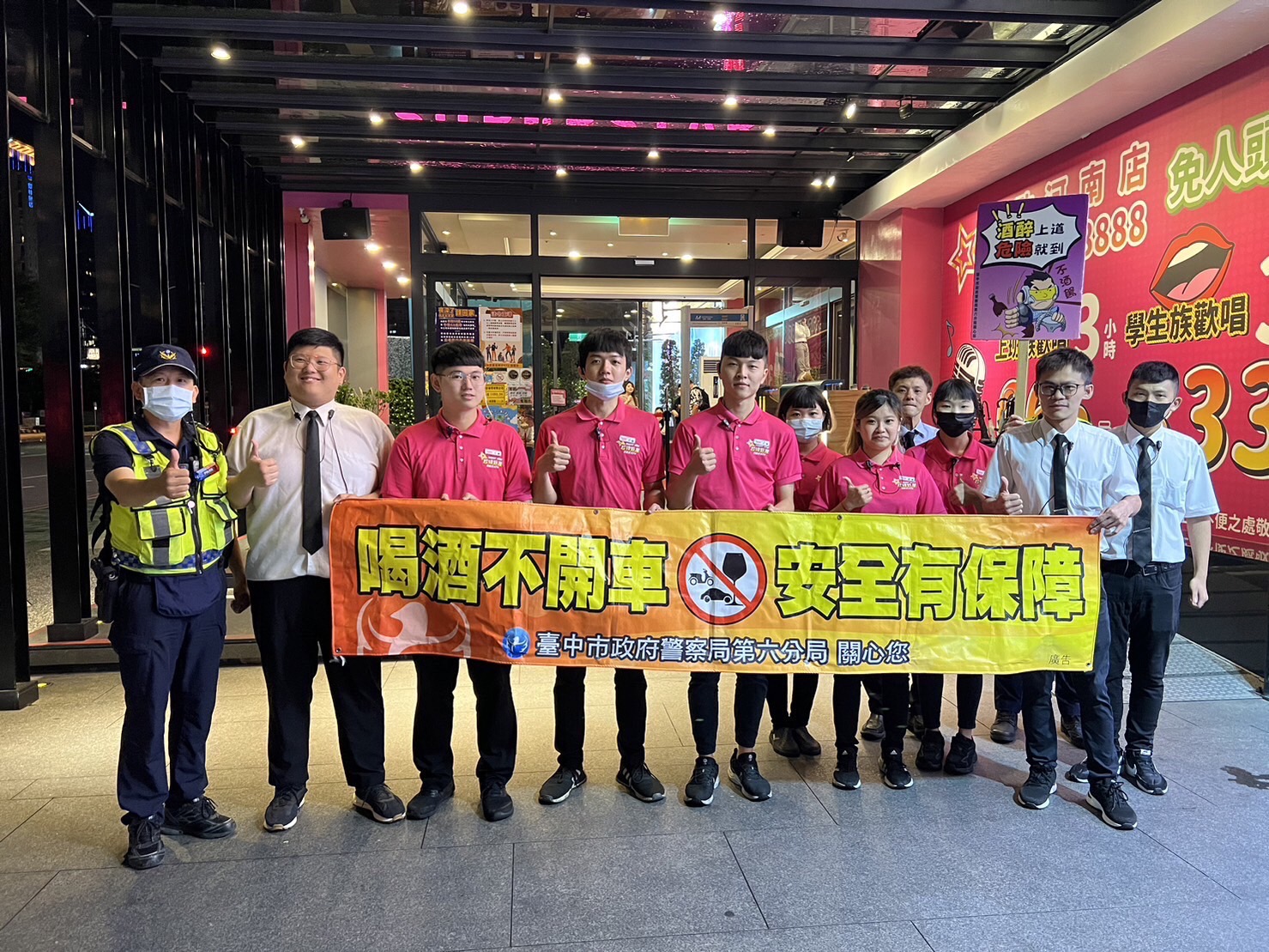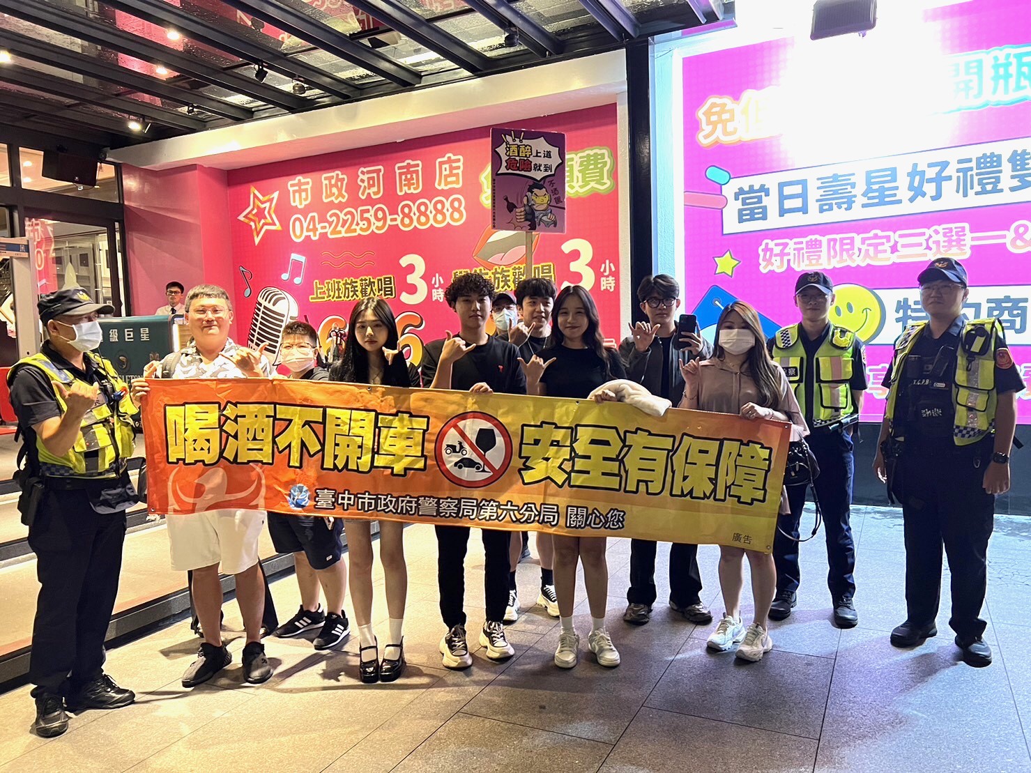 中市第六警分局配合警政署規畫全國性同步取締酒駕勤務時,針對轄內易發生酒後駕車路段及提供飲酒場所加強臨檢,市政所副所長江振堅也率員警前往轄內KTV進行宣導,提醒來KTV歡唱的帥哥辣妹們,若有飲酒切勿駕車上路,同行友人務必攔阻,並幫忙代叫計程車,避免「開車貪杯,樂極生悲」。