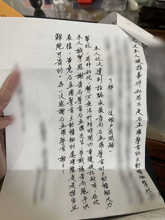 遇到詐騙時,民眾恐慌之下常常亂了方寸,除冀望警方能將車手繩之以法外,更企盼能將血汗錢討回。中市警六分局收到一則手寫信,信中寫滿了對員警的感謝,原因是員警日前於轄內抓到車手,並且積極聯繫被害人,協助她至鄰近派出所報案,及時追回10萬元血汗錢。