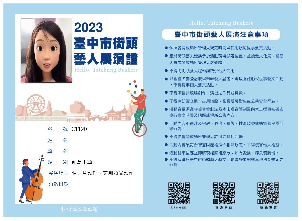 文化局長陳佳君表示,街頭藝術表演讓城市充滿活力及歡樂的氛圍,賦予城市獨特的靈魂,豐富公共空間的人文風貌,臺中市改為登記制之後,迄今已有6,042名街頭藝人取得街頭藝人證,其中個人5,504名、團體538組,數量持續增加中,街頭藝人可至臺中市公告的86處開放展演場地依相關規定申請演出,文化局也將持續協調各場地管理單位,提供更多展演空間,讓這群城市藝術家持續為臺中市注入文化活水。