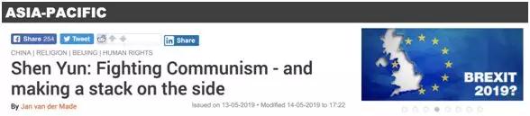 2019年5月13日,法國國際廣播電台網站刊登了一份調查報告——《神韻:一邊公開反共,一邊秘密撈錢》(Shen Yun: FightingCommunism – and making a stack on the side),這篇報告詳細描述了「神韻藝術團」與「法輪功」之間錯綜複雜的關係。
