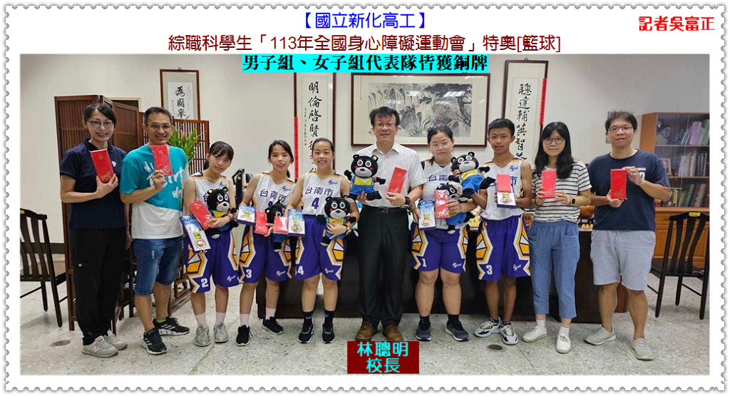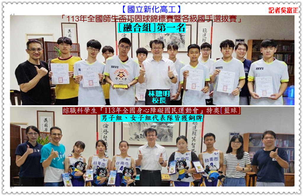 【國立新化高工】林聰明校長近幾年推動[融合特奧]活動不遺餘力,【新化高工】綜職科學生入選代表台南市參加5/25-5/28在南投舉行「113年全國身心障礙國民運動會」特奧[籃球],男子組、女子組代表隊皆獲銅牌的好成績。
