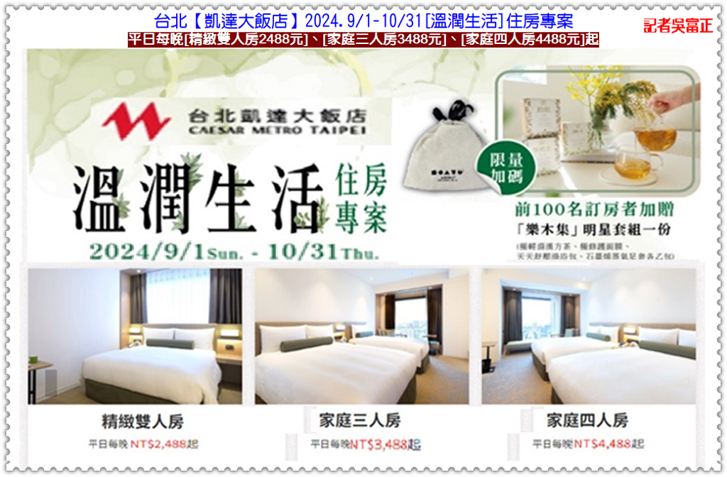 台北【凱達大飯店】2024.9/1-10/31推出「溫潤生活」住房專案,平日每晚[精緻雙人房2488元]、[家庭三人房3488元]、[家庭四人房4488元]起,前100名訂房者加贈價值五百元的漢方療癒套組乙個,套組包含清透回甘的「極輕濕漢方茶」、極致水嫩的「B5靈芝面膜」、古法秘傳的「漢方湯浴包」及活絡循環的「蒸氣足套」各一入,讓旅人可在客房來場暖身又紓壓的體驗。10月前入住「溫潤生活」住房專案,還可參加「秋遊凱達」抽獎活動,獎項包含沒有中藥味的養生漢方茶品「漢方茶暖心茶器禮盒」及「溫感足浴禮盒」。