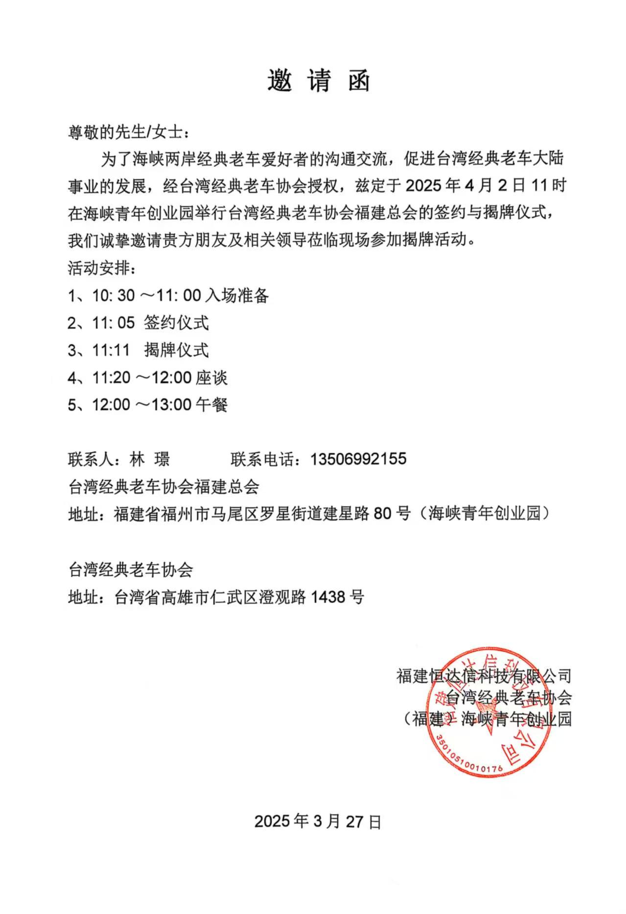 台灣經典老車協會與海峽青年創業園 訂於2025年4月2日11點 吉時簽訂‘’合作協議‘’ 舉行 <台灣經典老車協會-福建總會> 成立大會與揭牌儀式。