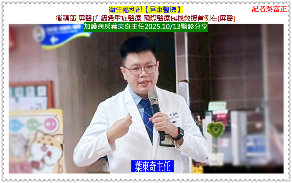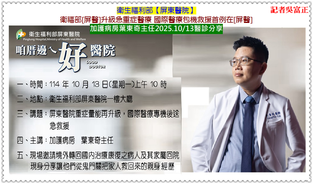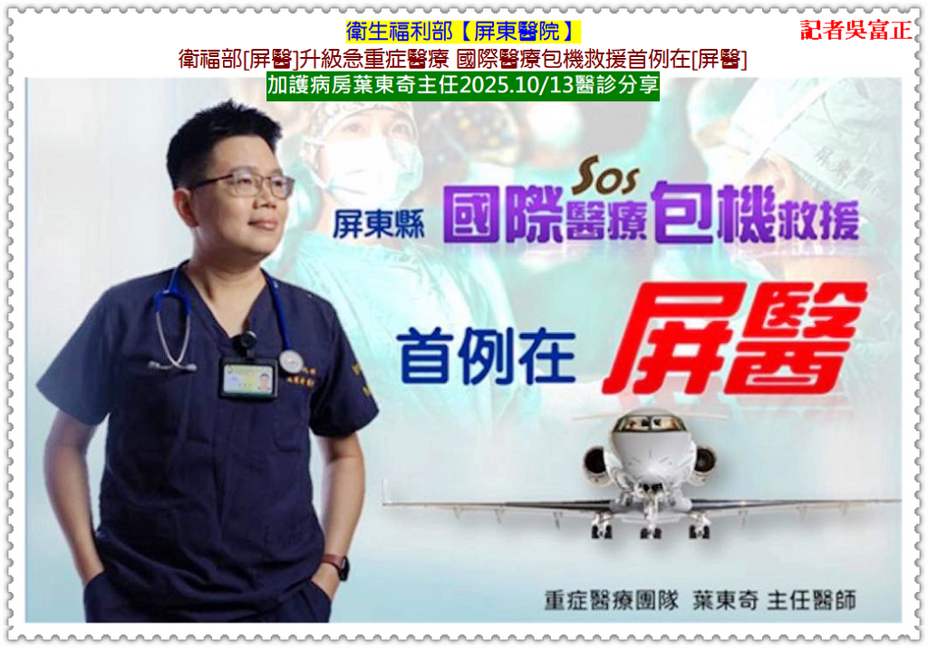 Posted in 健康醫藥 衛福部[屏醫]升級急重症醫療 屏東國際醫療包機救援首例在屏醫@華夏新聞報 Post Date 5 天 ago By: 新闻中心 【華夏新聞報-記者吳富正、吳泳潔/2025.10.13.屏東報導】 衛生福利...