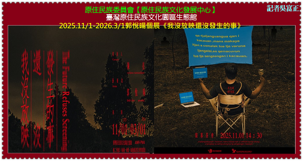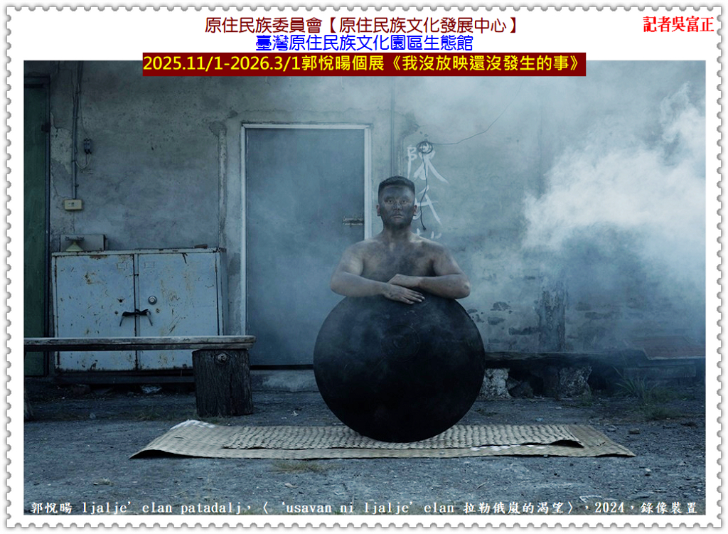 原住民族委員會【原住民族文化發展中心(原發中心)】2025.11/1至2026.3/1於臺灣原住民族文化園區[生態館] 舉行《我沒放映還沒發生的事》郭悅暘創作個展,11/1(六)14:30開幕茶會;屏東縣瑪家鄉排灣族藝術家郭悅暘以影像、聲音、物件與身體勞動為創作媒介,開啟一場關於「凝視與被凝視」的深層對話。從田裡的工具到攝影機,他在勞動與思考之間穿梭,讓影像成為回望自身與文化的方式。