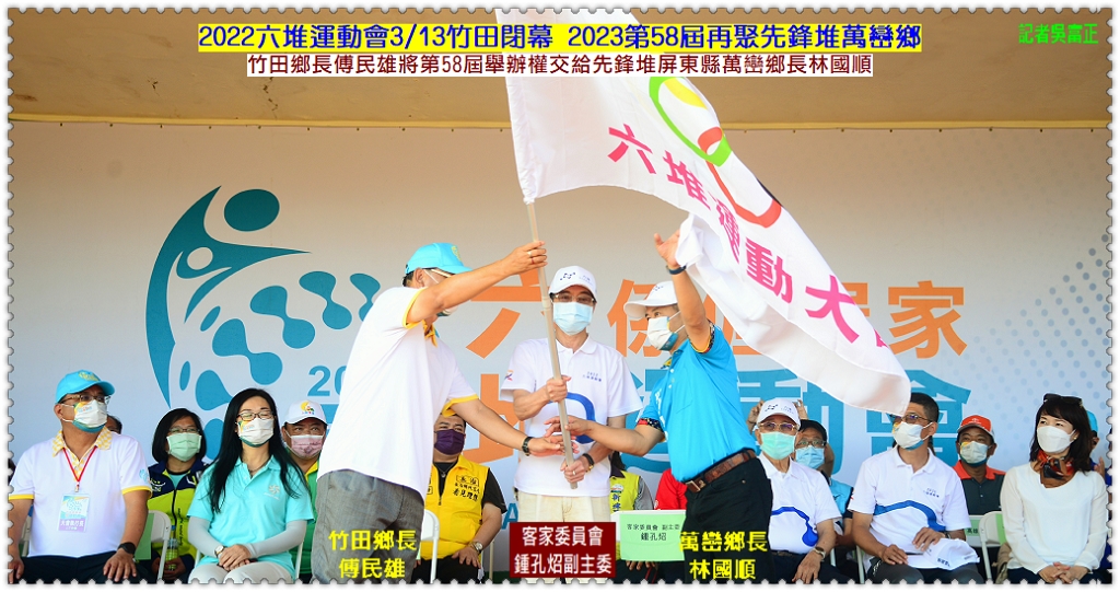 閉幕式由竹田鄉長傅民雄將第58屆舉辦權交給先鋒堆屏東縣萬巒鄉長林國順,象徵著六堆運動會用客庄各鄉區的文化特色及運動精神永續傳承下去,為客家文化保留最完整的歷史紀錄,讓整個客庄與非客家地區透過運動賽事有更多的互動與認識,促進族群間的團結與共榮。