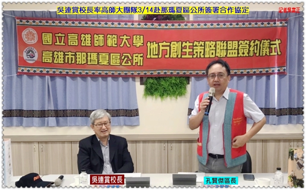 【國立高雄師範大學】吳連賞校長3/14率謝建元研發長、兼藝產班姚村雄主任、運產班潘倩玉主任、科教環教所黃琴扉教授、教育系劉世閔教授、語文班施朝凱助理教授、公關執行長鄂見智及研發處同仁等十四人,前往那瑪夏區公所,吳連賞校長與那瑪夏區孔賢傑區長共同簽署「地方創生策略聯盟合作」協定。
