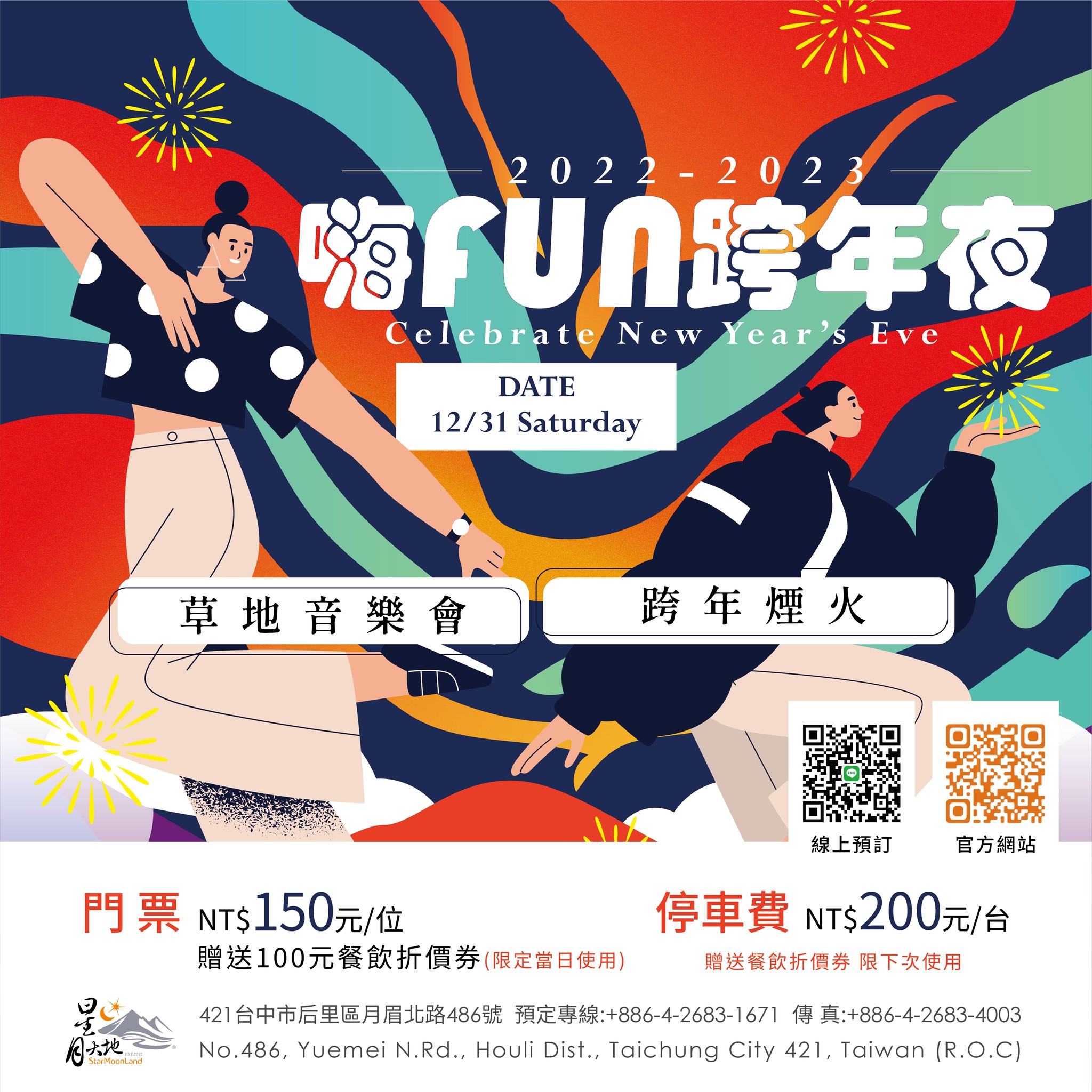 星月大地景觀休閒園區陳玫蒨特助表示,為了讓旅客體驗結合多重跨年玩法,星月大地景觀休閒園區與星月文旅今年特別推出「星月嗨FUN跨年夜」活動,規劃草地音樂會、跨年煙火秀、草地親子互動、主廚特色餐點等四大主題,跨年夜舉辦「大地BBQ」,希望讓旅客在2022最後一天與最重要的人暖呼呼、甜蜜蜜共同迎接新的一年。
