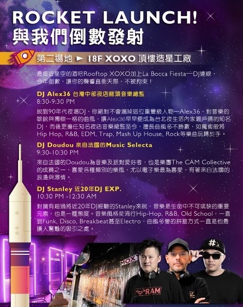 藝術亮點「台中豐邑Moxy酒店」「跨年銀河潮」派對精彩可期!1樓的the Moxy Bar「火箭基地」主題場舞台邀請聲林之王、DD52、為你唱情歌等節目音樂製作人張嚴之領銜的High Star樂團,包含DJ、歌手及舞者,帶來一系列熱鬧組曲;18樓Rooftop XOXO頂樓「造星工廠」主題舞台則安排La Bocca Fiesta,由國內外知名DJ輪番上陣,帶動迷幻狂熱氣氛。疫情期間飯店嚴格遵守防疫規範,皆採用酒精消毒,非餐飲區請務必佩戴口罩。詳細活動資訊及收費標準請至台中豐邑Moxy酒店官網( https://www.moxytaichung.com ) 或臉書粉絲專頁查詢。