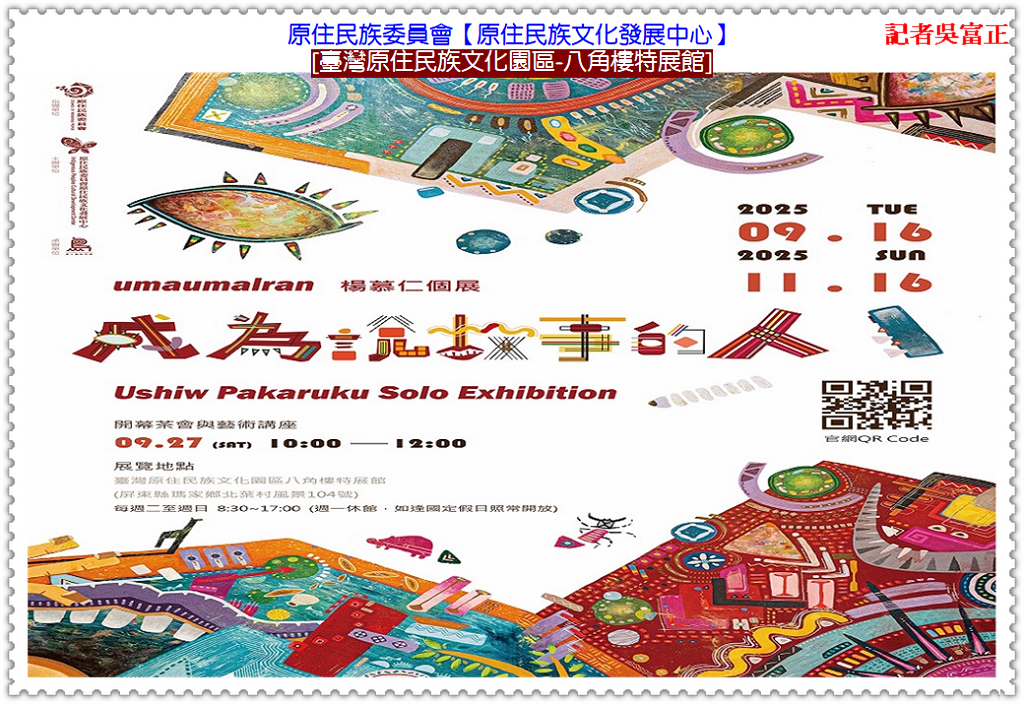 原住民族委員會【原住民族文化發展中心(原發中心)】2025年度第二場主題展覽「成為說故事的人」楊慕仁個展9/16-11/16於[臺灣原住民族文化園區-八角樓特展館]展出,9/27(六)10:00開幕;台東卑南族知本部落的楊慕仁(Ushiw Pakaruku)全新個展《umaumalran-成為說故事的人》,以「為什麼我們總是在看外面的故事?」為核心提問,透過繪畫探索文化根源,並展現原住民族如何以自身語言回應當代與全球對話。展覽由鄧雪真策展,呈現三大核心系列作品〈聽故事的人〉、〈說故事的人〉、〈成為說故事的人〉,共展出30餘件創作。楊慕仁以卑南語為敘事軸線,從傾聽到表達再到轉化,構築一條文化記憶持續生成的創作路徑。