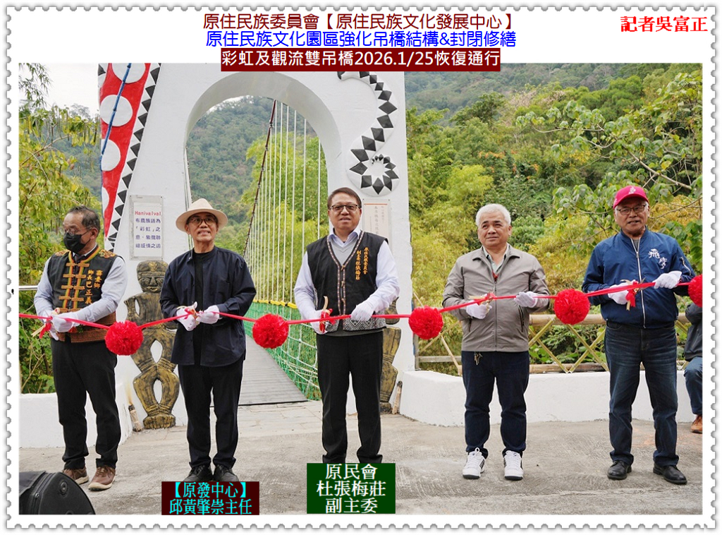 原住民族委員會【原住民族文化發展中心(原發中心)】原住民族文化園區2026.1/25舉辦「彩虹及觀流吊橋通橋啟用典禮」。在部落耆老的祈福聲中,原民會杜張梅莊副主委、【原發中心】邱黃肇崇主任、三地門鄉曾有欽鄉長、霧台鄉巴正義鄉長、瑪家鄉公所賴萬福秘書等共同剪綵,正式宣佈封閉修繕近兩年的彩虹橋(一號吊橋)、觀流橋(二號吊橋)恢復通行,趕在農曆春節前為遊客提供更安全、優質的文化體驗場域。