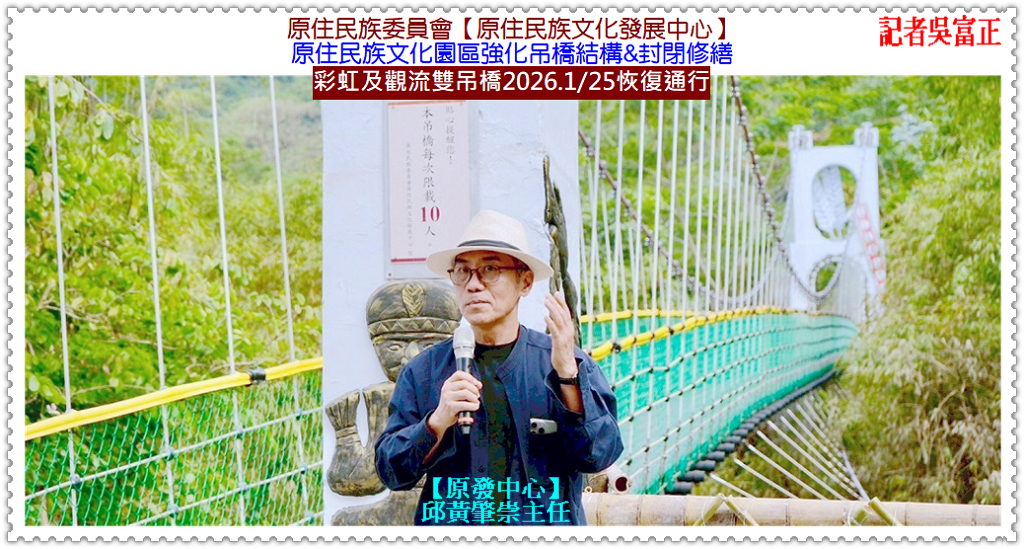 原住民族文化園區強化吊橋結構 彩虹及觀流雙吊橋2026.1/25恢復通行@華夏新聞報